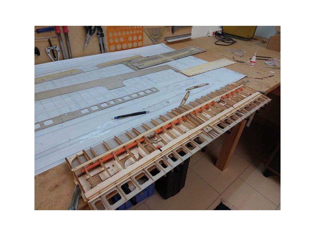 Plán se pokládá na rovnou dřevěnou pracovní desku z měkkého dřeva (laťovku), na plán je potřeba položit průhlednou fólii která ochrání plán před lepidly. K lepení používáme modelářské špendlíky kterými se fixují součásti v přesné pozici. Běžné lepení dřevěných dílů se lepí disperzním PVA lepidlem nebo Super Phatic lepidlo na dřevo které mají výhodu v pomalém schnutí, proto je na sestavení konstrukce dost času. Slepená konstrukce se může sundat druhý den po slepení.