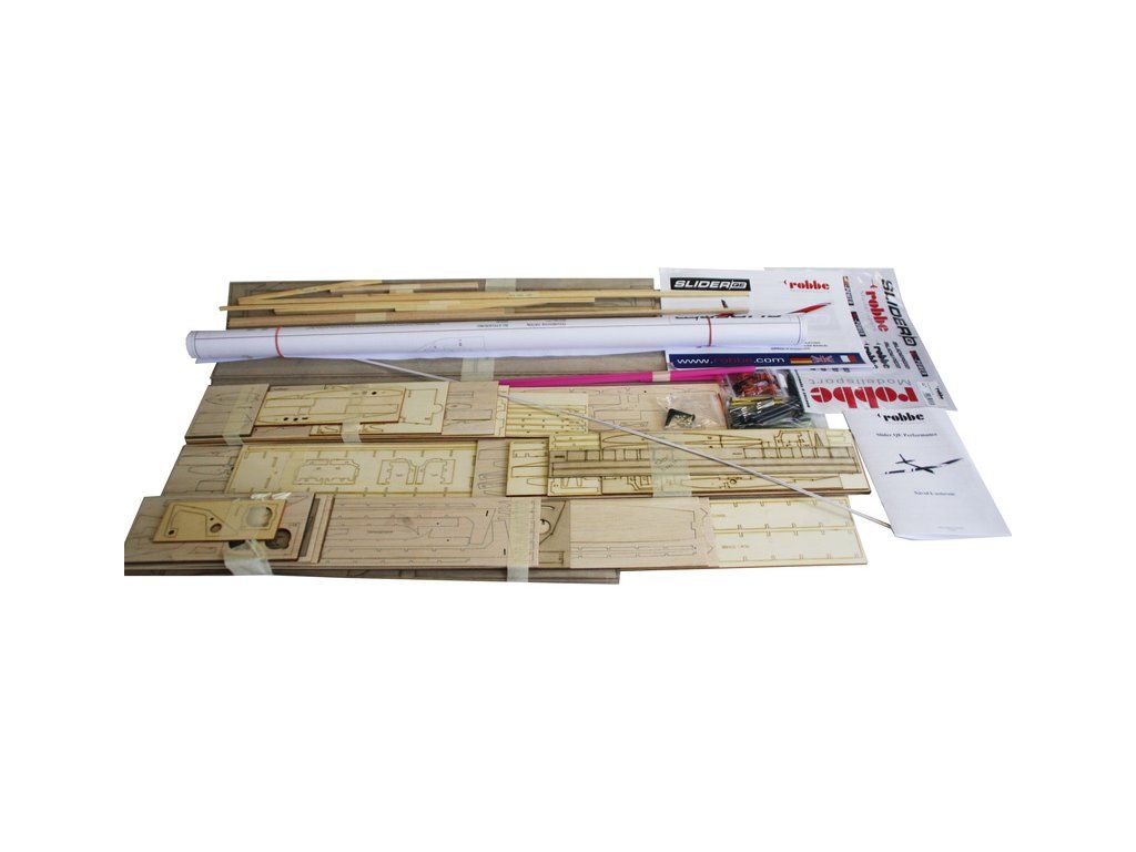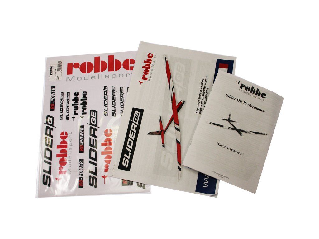 Stavebnice RC modelu Slider QE Performance obsahuje kompletní dřevěné součásti, stavební plán, montážní příslušenství a vícejazyčný manuál v angličtině, němčině a francouzštině a český návod.