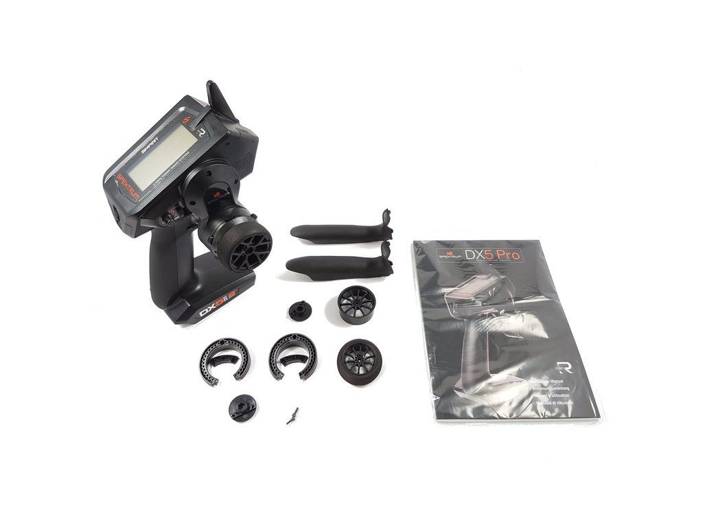 Balení obsahuje RC vysílač DX5 Pro 2021, úhlové vložky 10˚ a 15˚, 2x náhradní rukojeť, menší volant, omezení rozsahu volantu 32°, 36°, náhradní kolo volantu. Návod CZ a manuál EN, DE, FR, IT.