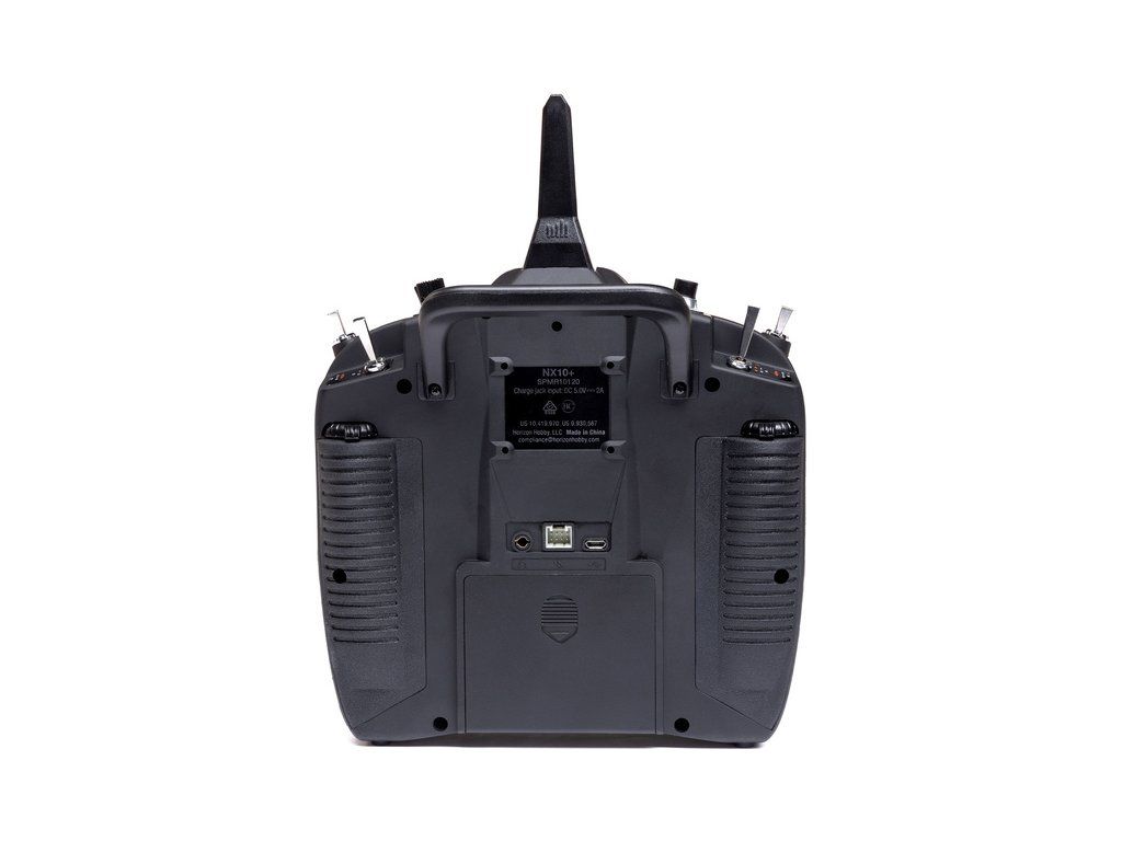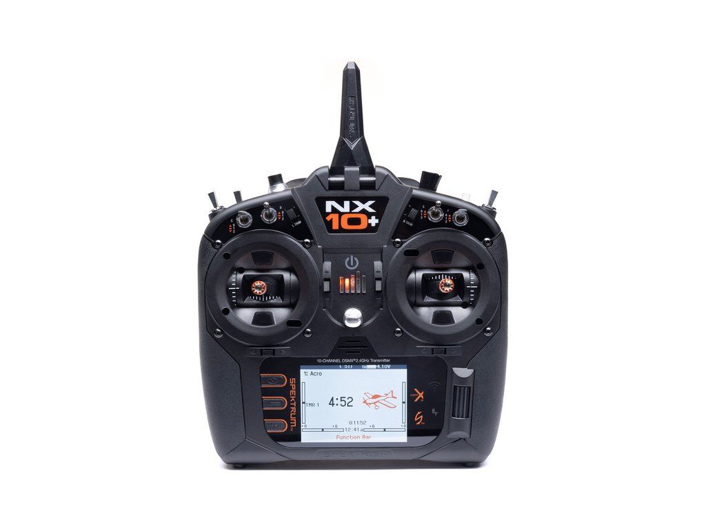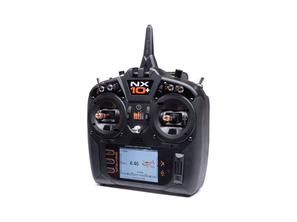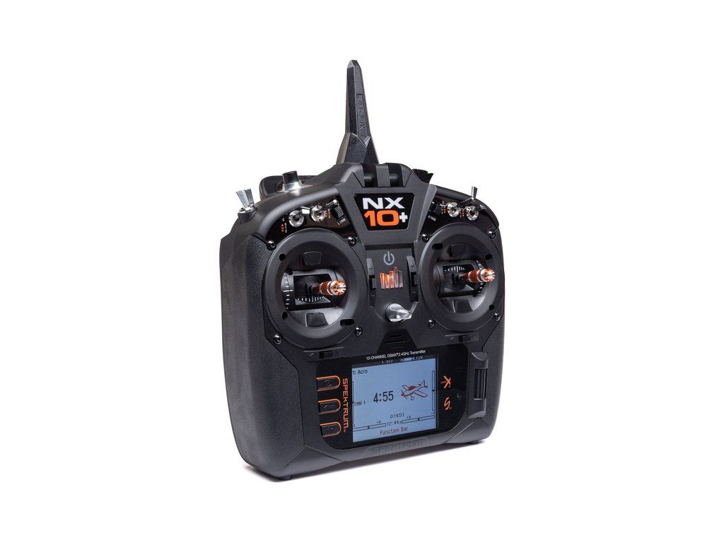 10-kanálový vysílač Spektrum NX10+ DSMX s 20 kanály. Barevný podsvícený displej, LiIon baterie, kompatibilita Smart Technologie, port USB, možnost připojení WiFi pro registraci a aktualizaci. Křížové ovladače Hallovými senzory. Nové funkce nastavení a uživatelské audio hlášení.