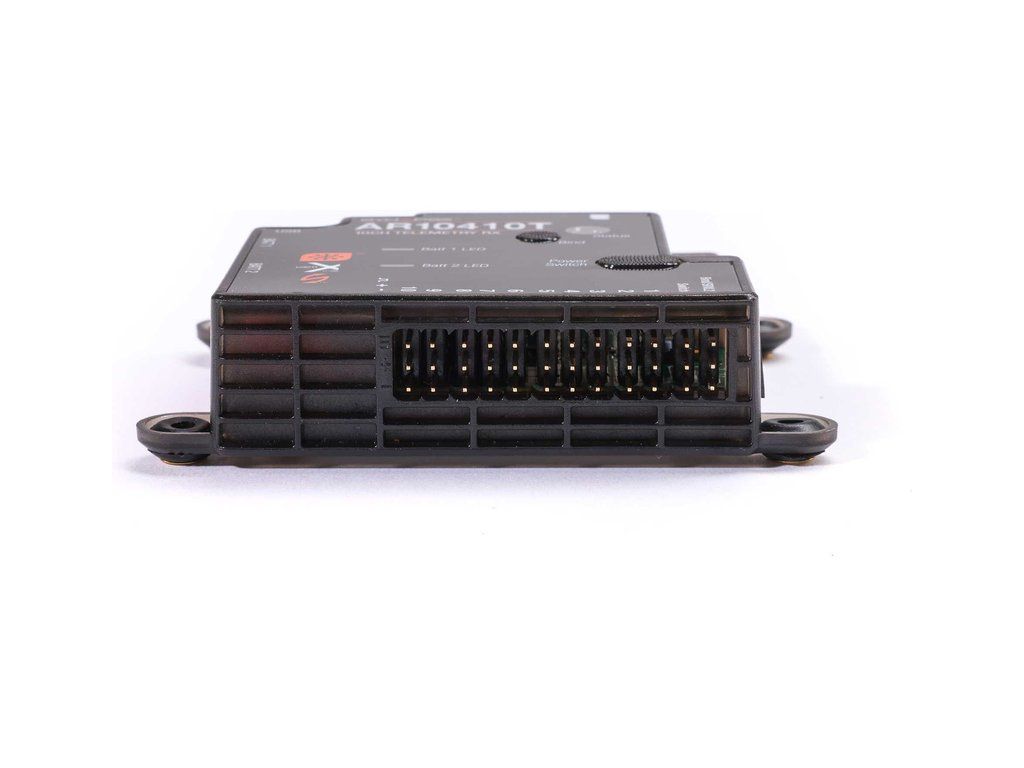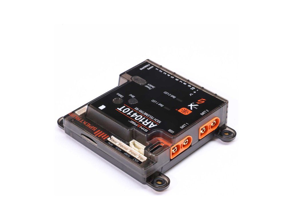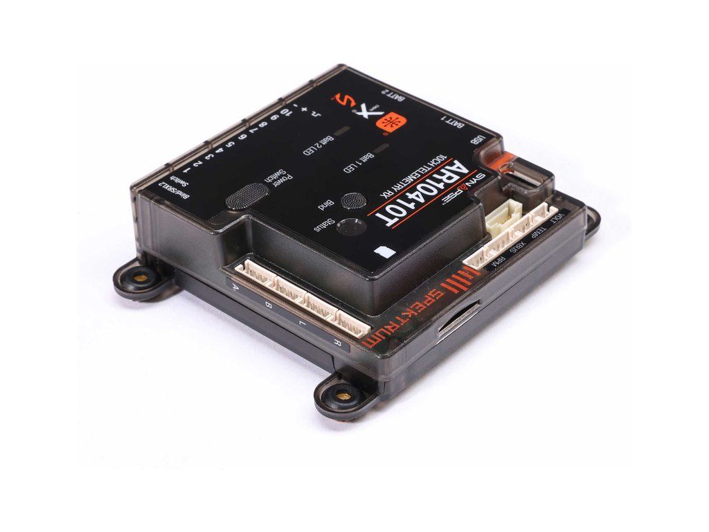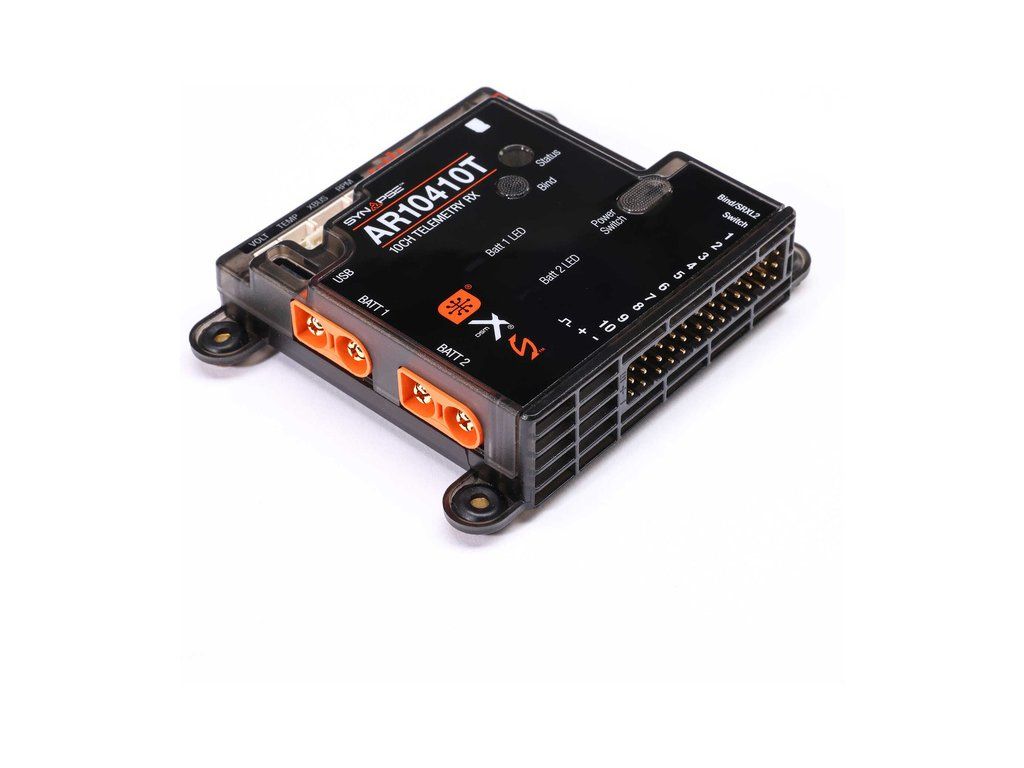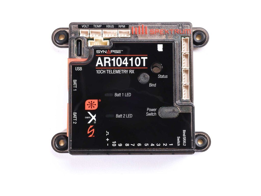 RC přijímač Spektrum AR10410T PowerSafe s 10 kanály a s telemetrií. Konektory pro telemetrické čidla otáček, napětí a teploty, konektor X-Bus. Redundantní napájení dvojicí baterií s konektory IC3. Vhodný pro obří modely letadel, větroňů a vrtulníky. Možnost zapojení modulu AS3X+/SAFE. Barometrický senzor.