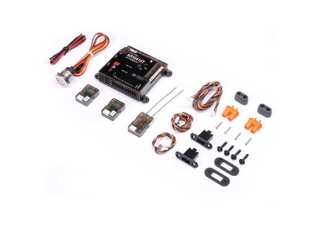 V balení je přijímač Spektrum AR10410T, 1x Spektrum Serial SRXL2 s telemetrií, 2x Spektrum DSMX SRXL2, kabely přijímačů s délkou: 22, 30, 60 cm, 2ks konektor IC3, senzor napětí, vypínač, 2ks nabíjecí zásuvka. Návod v češtině a manuál EN, DE, FR, IT.