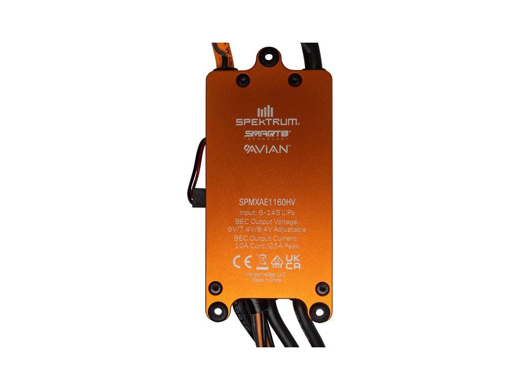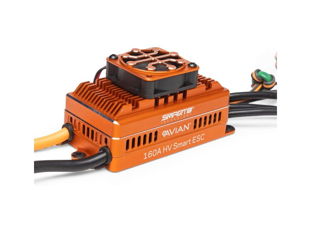 Letecký regulátor Spektrum Smart Avian 160A HV pro 6-14 článků LiPol, konektor IC5, s telemetrií SMART, která se přenáší prostřednictvím kompatibilních přijímačů Spektrum s telemetrií.. BEC max. 25A, stálý 10A. Rozměry 88x50x36mm, hmotnost 376g.