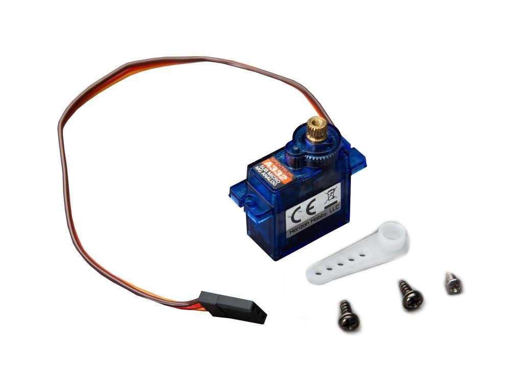 Náhradní díl pro RC model letadla Timber X 1,2m: Spektrum servo A332 9g MG. Rozměry 22.3 x 11.8 x 22.5 mm.