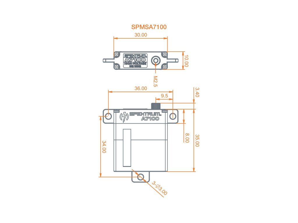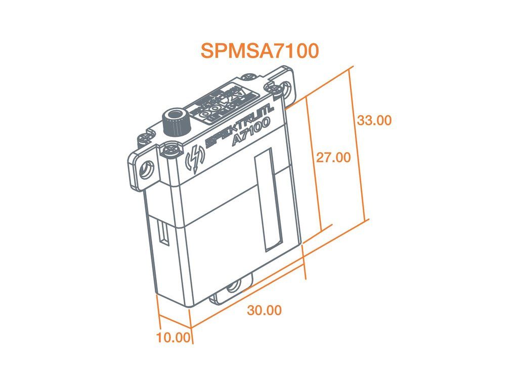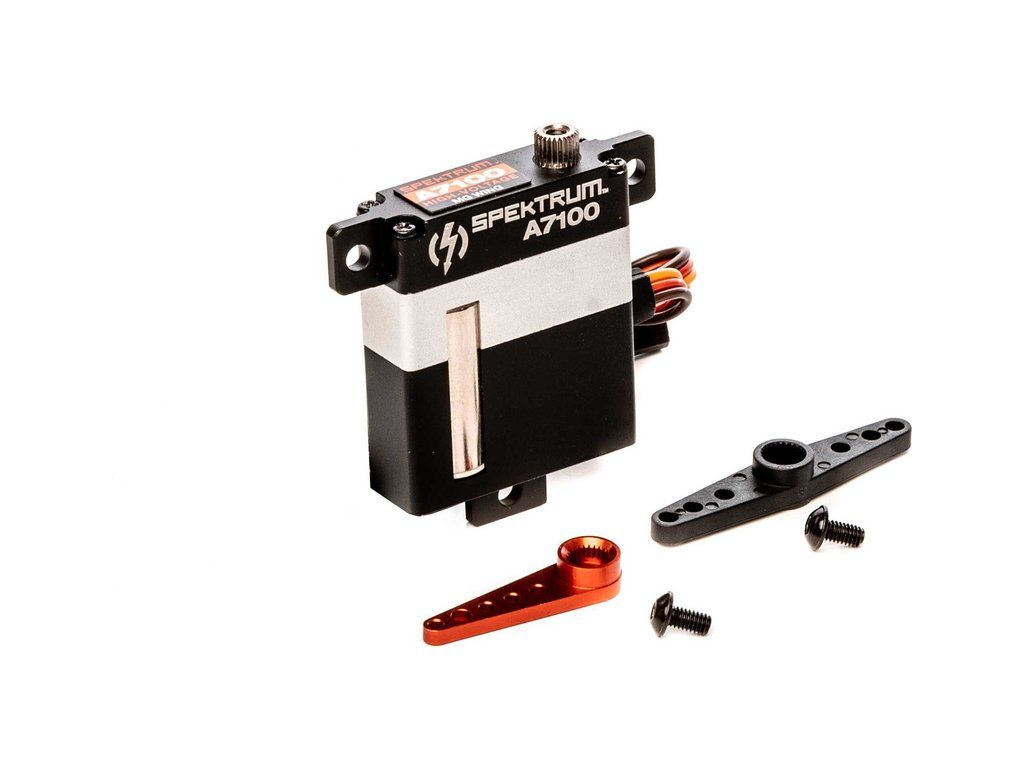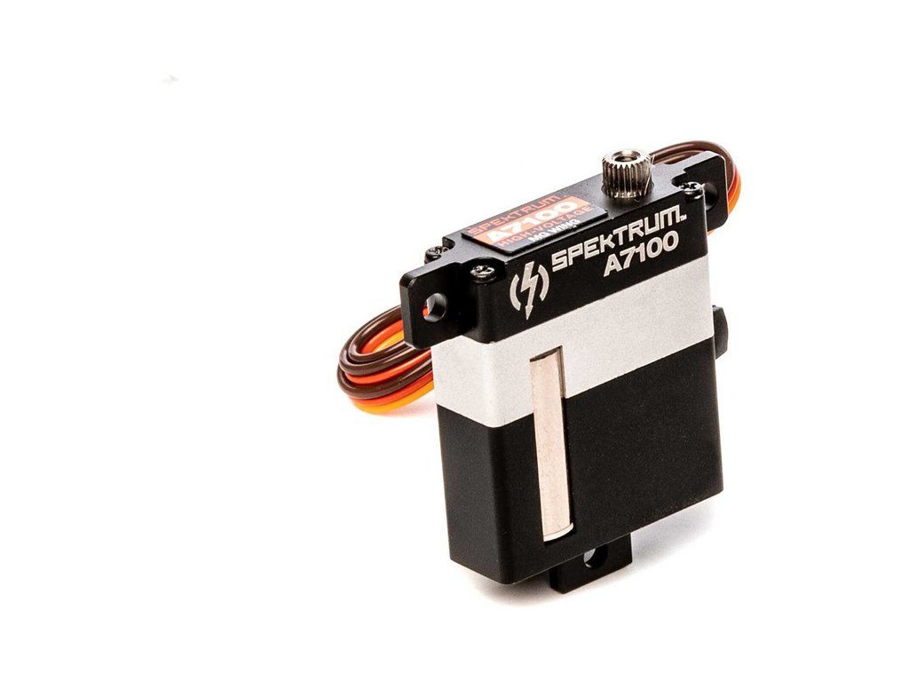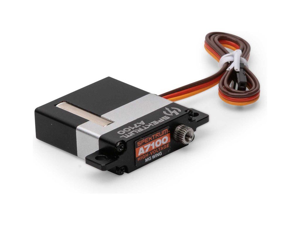 Digitální speciální úzké Spektrum servo A7100 je ideální do štíhlých profilů křídel letadel, má moment 8.3kg.cm, rychlost 0,078s/60° při napájení 8,4V. Hmotnost 28g, rozměry 10mm x 30mm x 35mm. Kuličkové ložisko a kovové převody.
