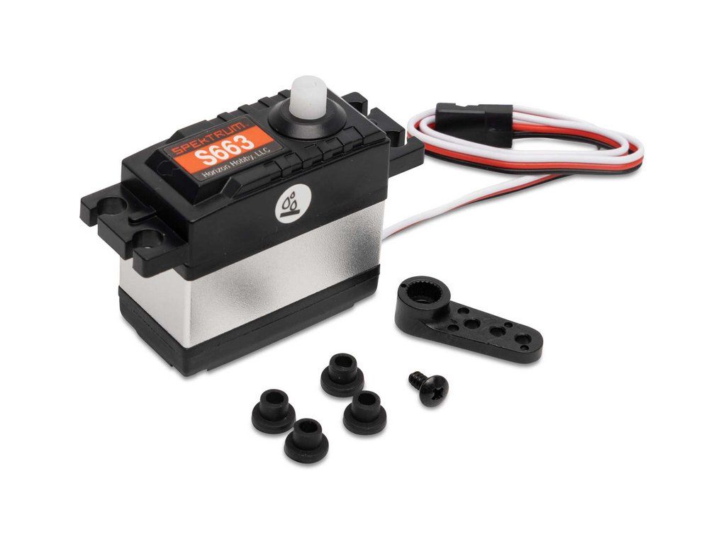 Balení obsahuje servo Spektrum S663, páku (D = 17mm),1x šroub páky, 4x silentblok.