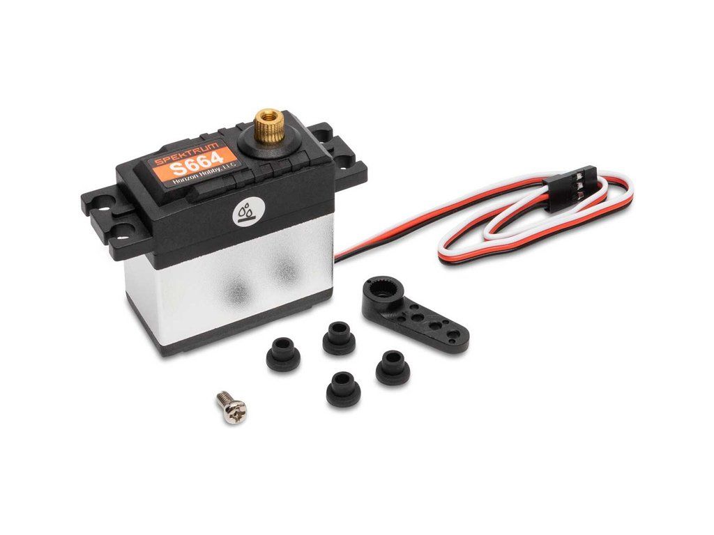 Balení obsahuje servo Spektrum S664, páku (D = 16mm),1x šroub páky, 4x silentblok.
