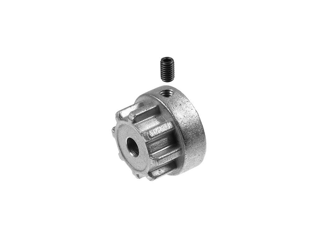 Spojka hřídelí adaptér Flex kovový, průměr 18mm, délka 12mm, vnější průměr ozubení 15,4mm, vnitřní 11,8mm, otvor 4mm, pojištění červíkem M3. Pro pružnou Spojku hřídelí Flex 18 .