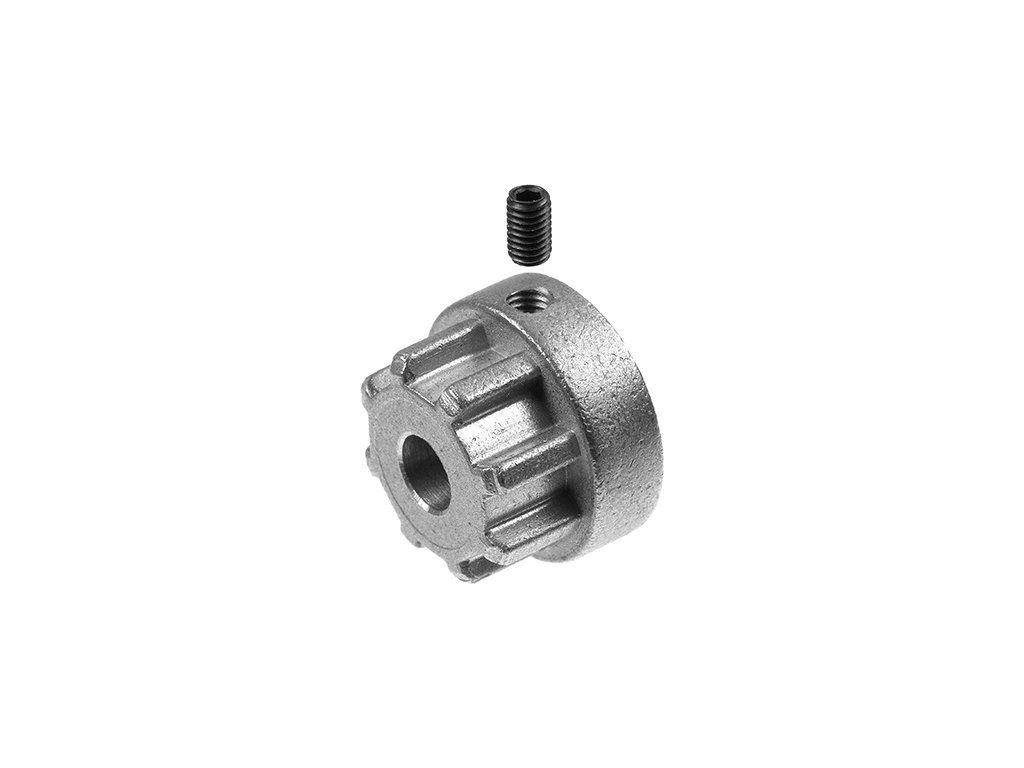 Spojka hřídelí adaptér Flex kovový, průměr 18mm, délka 12mm, vnější průměr ozubení 15,4mm, vnitřní 11,8mm, otvor 5mm, pojištění červíkem M3. Pro pružnou Spojku hřídelí Flex 18 .