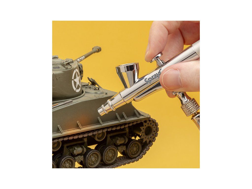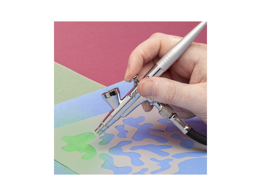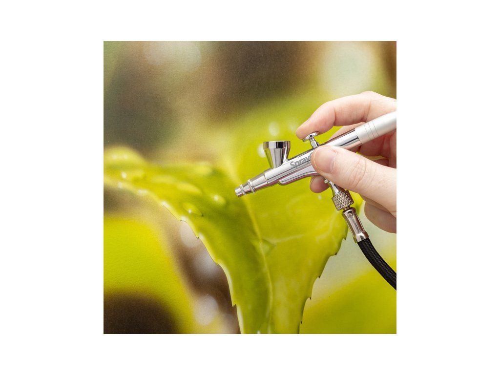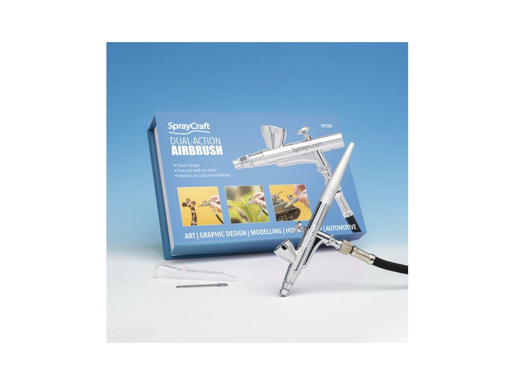 Spraycraft airbrush stříkací pistole SP25 je dvoučinná, stiskem spouště se uvolní vzduch a pohybem dopředu nebo dozadu se volí množství barvy. Nádobka 2 ml s víčkem je v horní části, tryska o průměru 0,3 mm.
