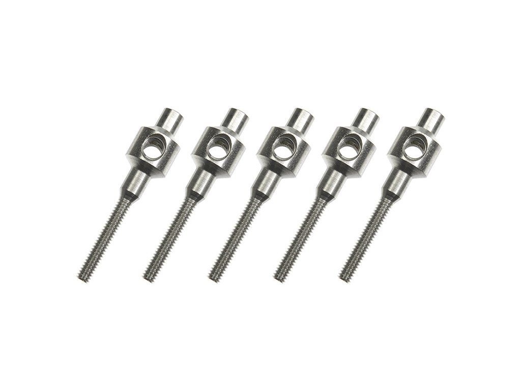 Stavitelná koncovka s vnějším závitem M2 a otvorem pro drát do průměru 2.1mm. Drát se v koncovce pojistí dvěma červíky M3 (nejsou v balení). 5 ks v balení, materiál niklovaná ocel.