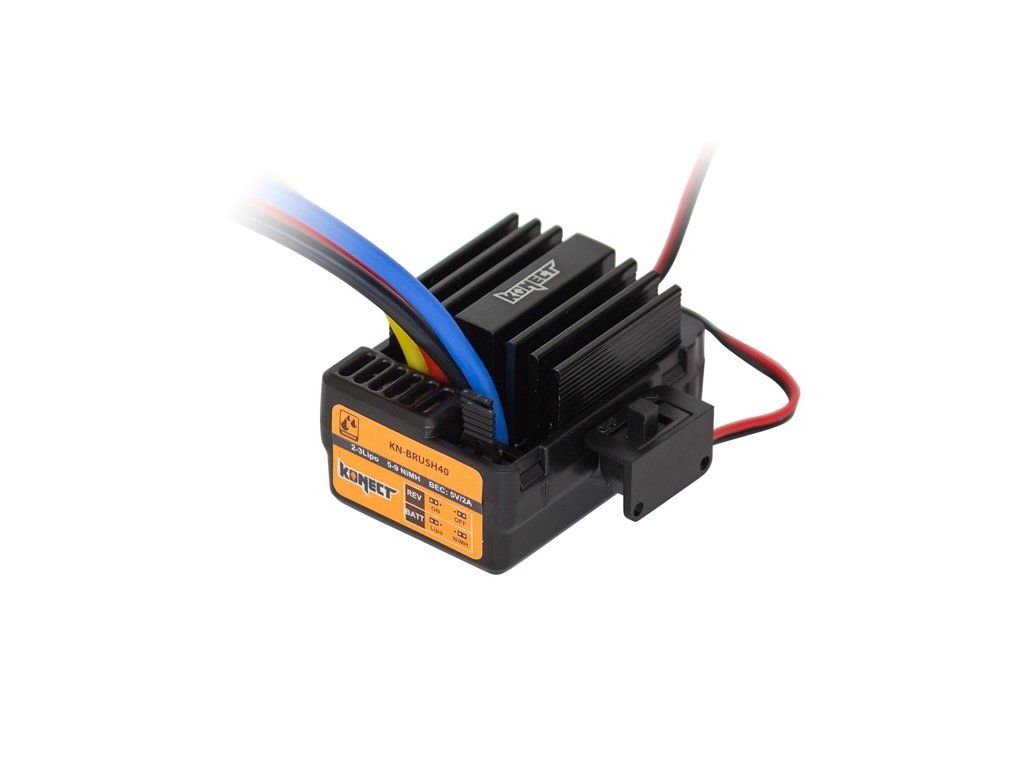 Regulátor s trvalým zatížení 40A je vodotěsný a má BEC, který poskytuje 5V s napájením 2A, a proto je dostatečný pro všechny oblasti použití běžné v tomto měřítku. Pomocí přepínacích můstku lze snadno přepínat mezi provozem LiPo a NiMH, není nutné žádné časově náročné programování. Zpětný chod lze také v případě potřeby jednoduše deaktivovat, což může být výhodou, zejména při závodění.