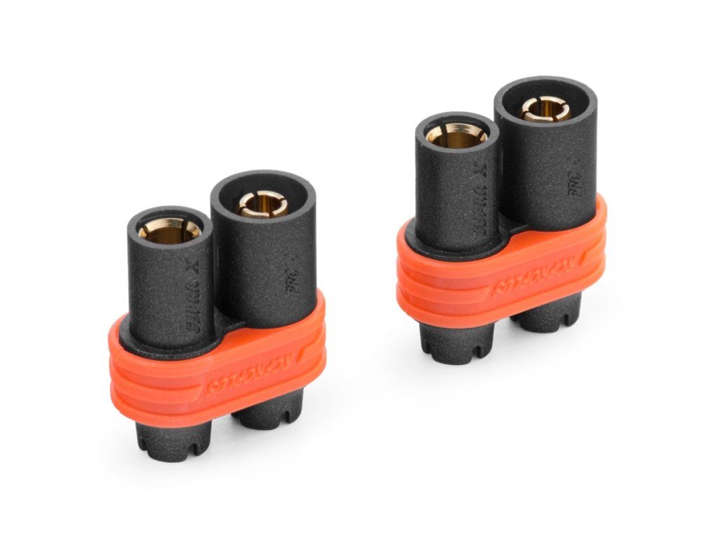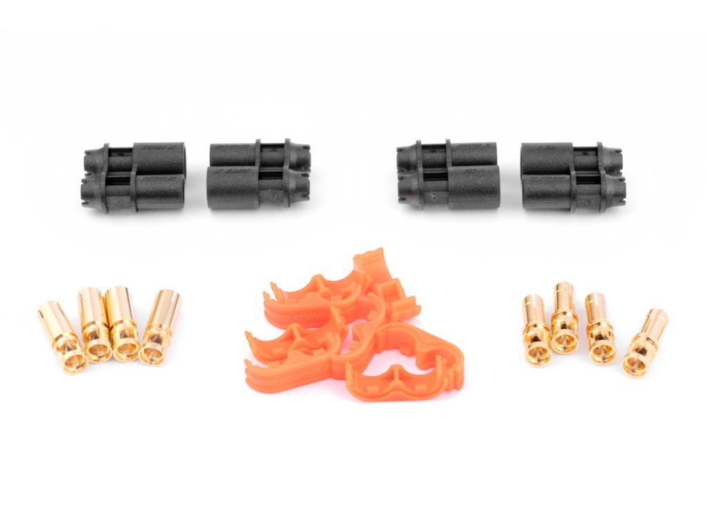Zlacené 4mm konektory se společným domkem pro 2-3,3 mm2 (12-14AWG) kabel. Konstantní proud 80A, špičkový 100A. Balení 4 páry.