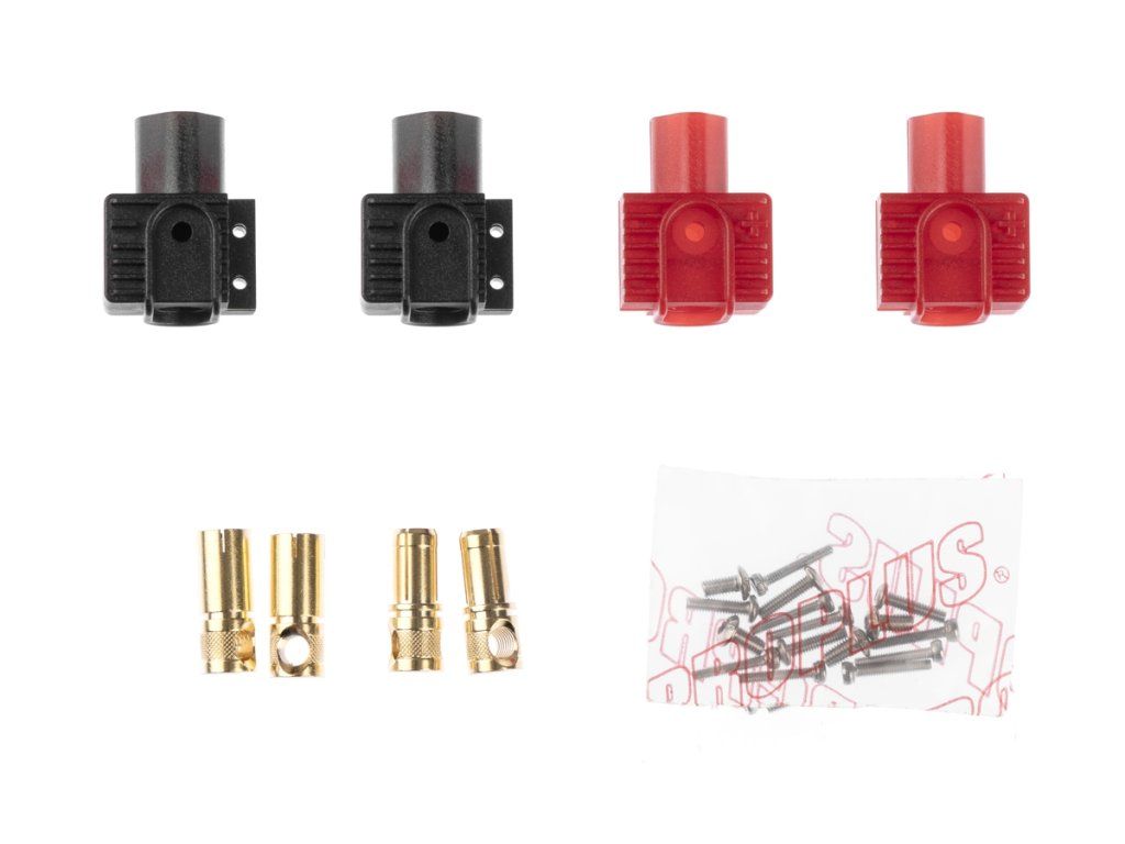 Zlacené 7mm konektory s domkem pro montáž do rámu vrtulníků SAB Goblin 700 Pro/RAW/KSE. Zastrčením pohonné baterie do slotu dojde k zapojení konektorů. Varianta s kolmým přívodem kabelu do konektoru. Pro 8,4mm2 (8AWG) kabel, konstantní proud 280A, špičkový 350A. Max 60V DC. Nepájecí varianta - kabel je zajištěn pomocí imbusového červíku. Balení 2 páry (2x černý a 2x červený konektor) pouze pro Akku. Objednací kód výrobce RAS7808 D7 SAB BAT2.Doplňkové parametry