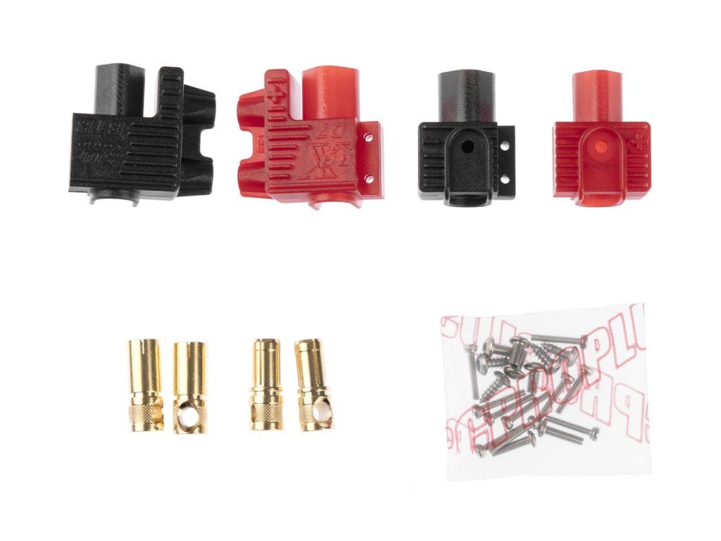 Zlacené 7mm konektory s domkem pro montáž do rámu vrtulníků SAB Goblin 700 Pro/RAW/KSE. Zastrčením pohonné baterie do slotu dojde k zapojení konektorů. Varianta s kolmým přívodem kabelu do konektoru. Pro 8,4mm2 (8AWG) kabel, konstantní proud 280A, špičkový 350A. Max 60V DC. Nepájecí varianta - kabel je zajištěn pomocí imbusového červíku. Balení 1 pár (černý a červený konektor) pro Heli a 1 pár (černý a červený konektor) pro Akku. Objednací kód výrobce RAS7808 D7 SAB S1.Doplňkové parametry