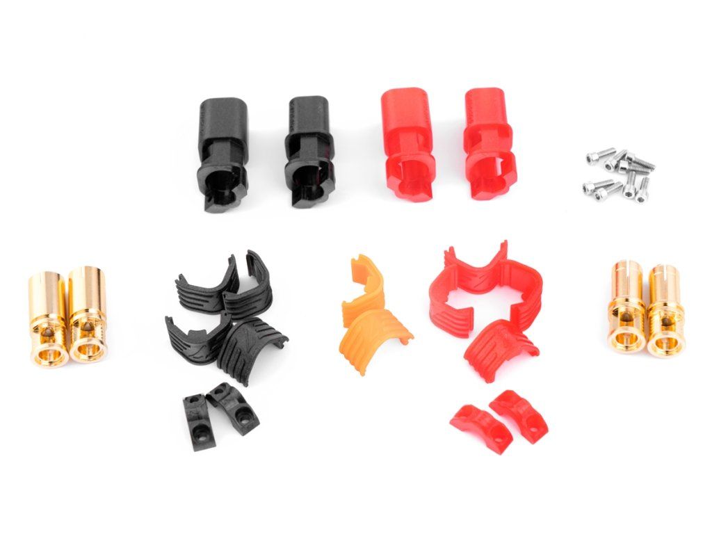 Zlacené 7mm konektory s domkem pro 5-8,4 mm2 (8-10AWG) kabel. Konstantní proud 240A, špičkový 280A. Max 60V DC. Pájecí varianta. Balení 2 páry (1 červený a 1 černý).Doplňkové parametry