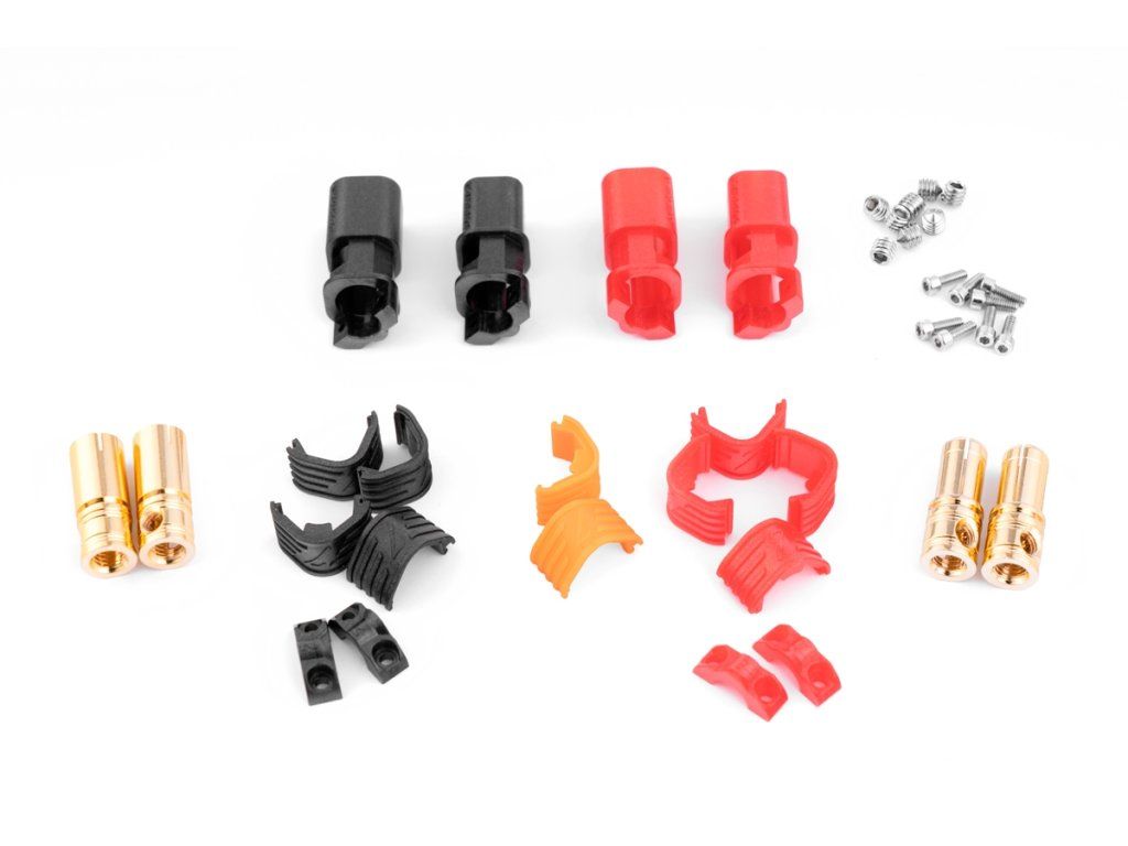 Zlacené 7mm konektory s domkem pro 8,4mm2 (8AWG) kabel. Konstantní proud 280A, špičkový 320A. Nepájecí varianta - kabel je zajištěn pomocí dvou imbusových červíků. Balení 2 páry (1 červený a 1 černý).Doplňkové parametry