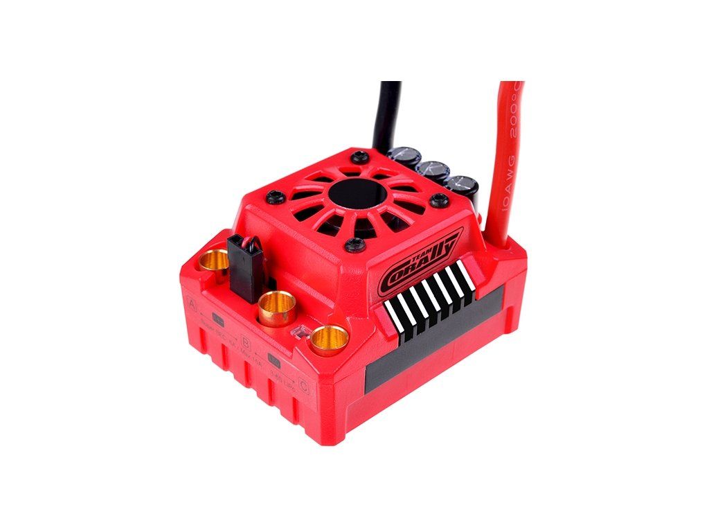 Programovatelný bezsenzorový střídavý regulátor pro modely aut 1/8. Pro motory 3-6S, 4S = 3000Kv a 6S = 2400Kv, napájení 11,1-22,2V, 9-18 NiMh/3-6 LiPO článků, hmotnost 189g, BEC 6-7,4V/6A, rozměry 60x48x36,2mm s větrákem.Doplňkové parametry