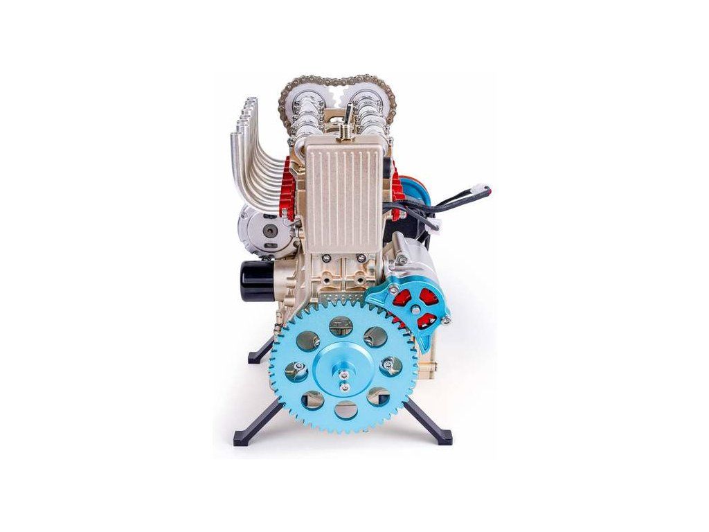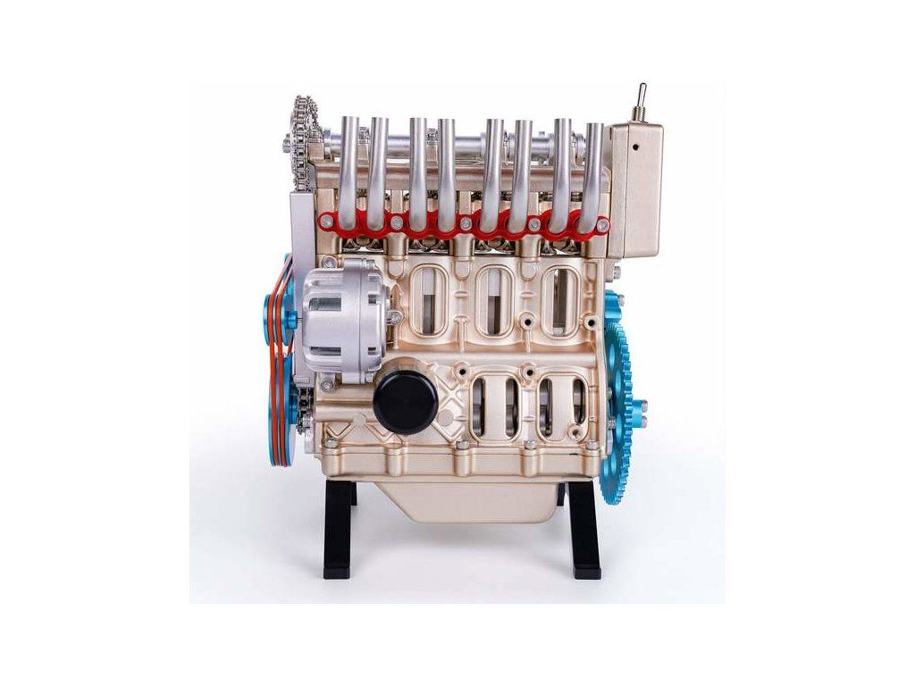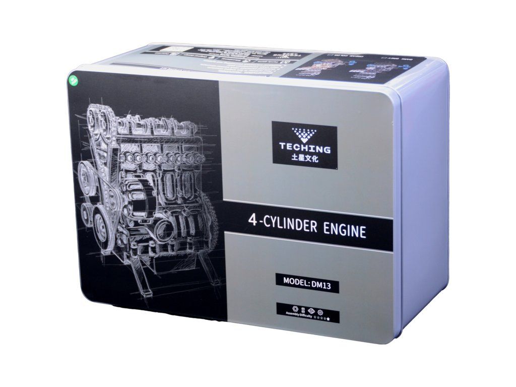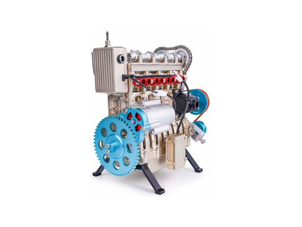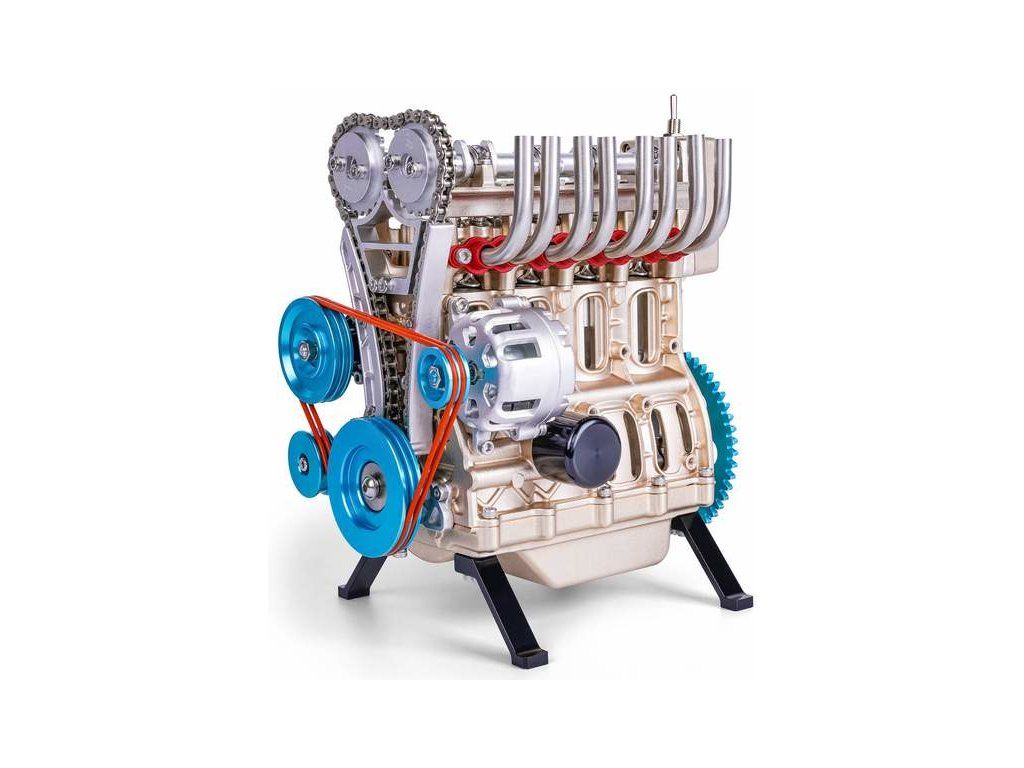 Stavebnice precizního kovového modelu Teching - čtyřválcový motor. Detailně reprodukovaná konstrukce reálného motoru s otevřenou hlavou. Model obsahuje realistické mechanické funkce - pohyb pístů, ventilů, hřídelí a rozvodů. Elektrické otáčení motoru. Výstavní model.