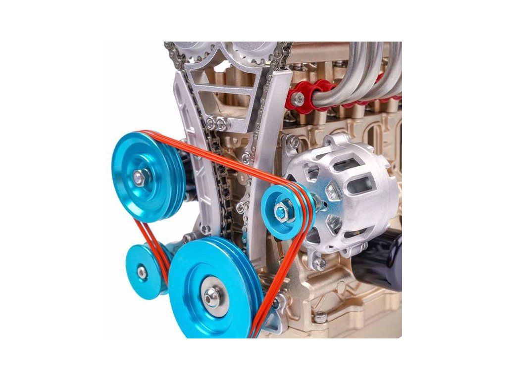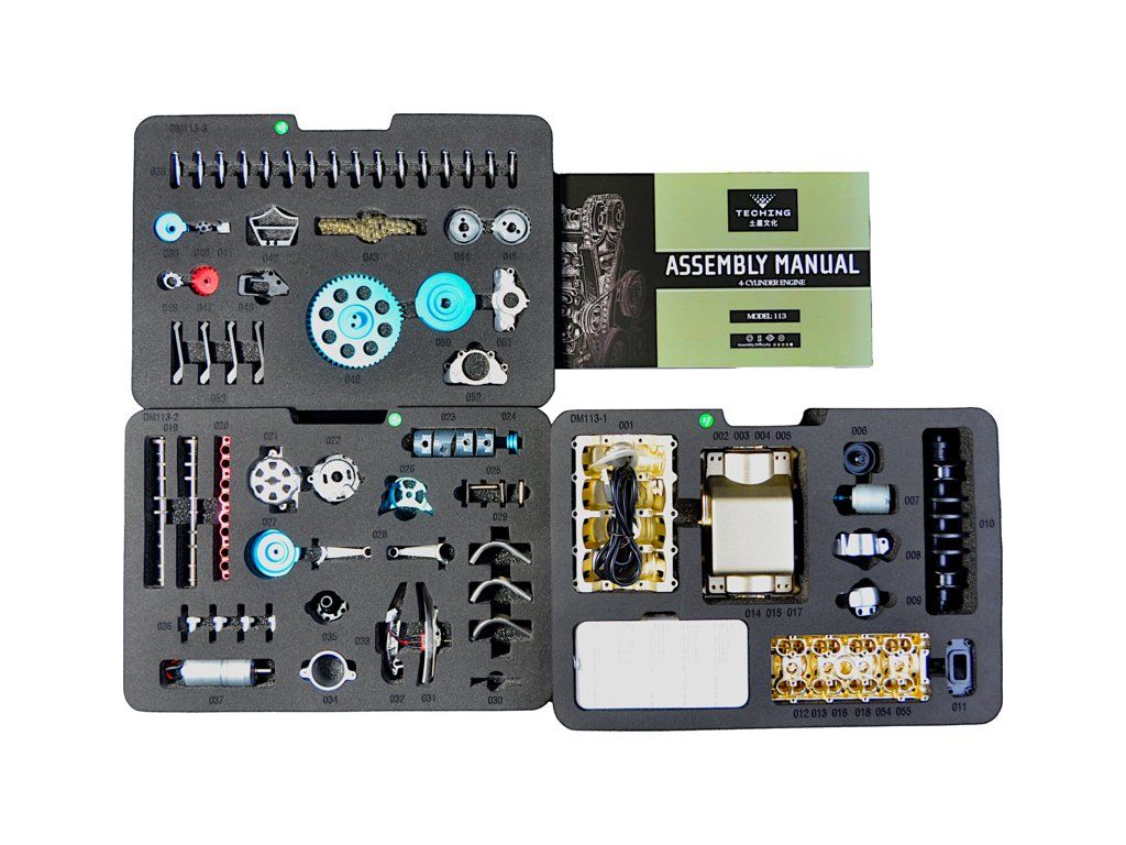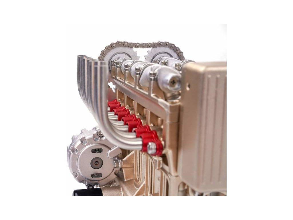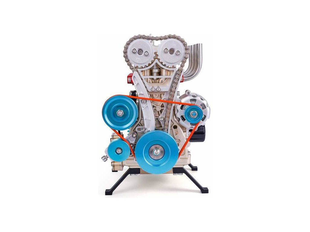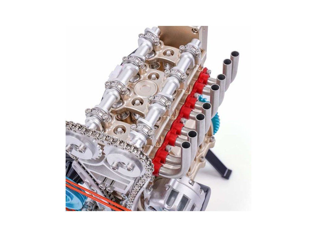 Stavebnice precizního kovového modelu Teching - čtyřválcový motor. Detailně reprodukovaná konstrukce reálného motoru s otevřenou hlavou. Model obsahuje realistické mechanické funkce - pohyb pístů, ventilů, hřídelí a rozvodů. Elektrické otáčení motoru. Výstavní model.