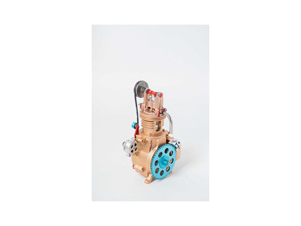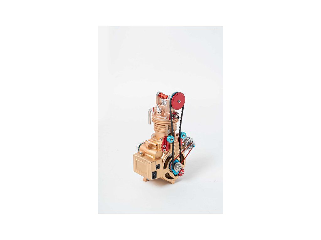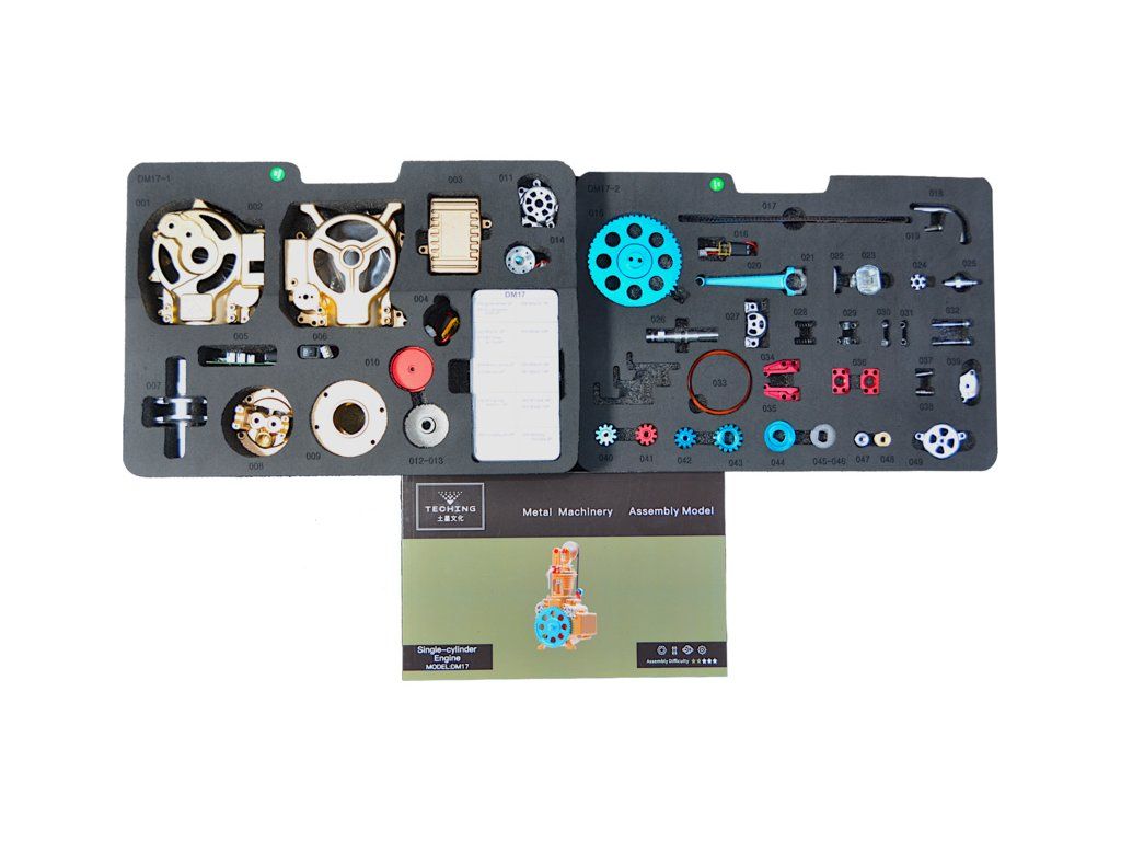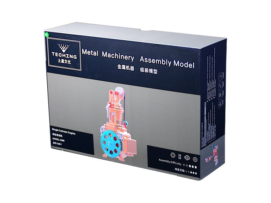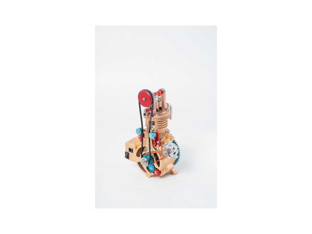 Stavebnice precizního kovového modelu Teching - jednoválcový motor. Věrně zpracovaná konstrukce skutečného motoru se všemi detaily, včetně olejového čerpadla, alternátoru a startéru. Realistické mechanické funkce - pohyb pístů, ventilů a rozvodů. Elektrické otáčení motoru. Výstavní model.