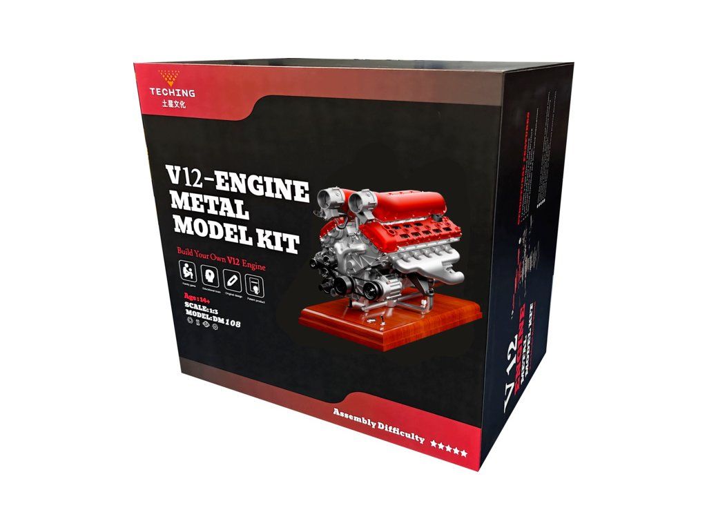Stavebnice precizního kovového modelu Teching motor V12. Autenticky zpracovaná konstrukce skutečného motoru se všemi detaily. Model nabízí realistické mechanické funkce - pohyb pístů, ventilů, hřídelí a rozvodů. Elektrické otáčení motoru a zvukové efekty. Výstavní model.