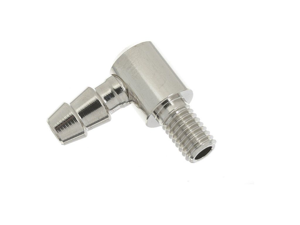 Průchodka nádrže zahnutá M5, venkovní rozměry 19x18mm, průměr 8mm, závit M5, koncovka pro hadičku 6/5mm. (1 ks)