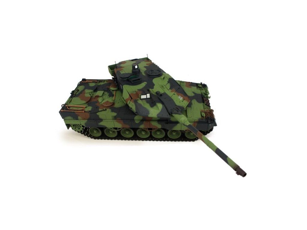 Výkonný model tanku má RC ovládání 2,4 GHz. Tank je vybaven IR i BB Airsoft bitevním systémem, takže jsou možné bitvy mezi modely. Motory s optimalizovaným točivým momentem dodávají modelu LEOPARD 2A6 NATO kamufláž přesnou a plynulou jízdu. Díky proporcionálnímu ovládání se můžete s tankem přiblížit velmi pomalu a plynule zvyšovat rychlost. LEOPARD 2A6 NATO kamufláž se pohybuje dopředu a dozadu včetně zatáčení. Lze jej také na místě otočit doleva nebo doprava. Můžete zvednout a spustit dělo a otočit věž o 320 stupňů (na každou stranu 160°). Realistický zážitek završuje zvuky motoru a kouř z výfuku.