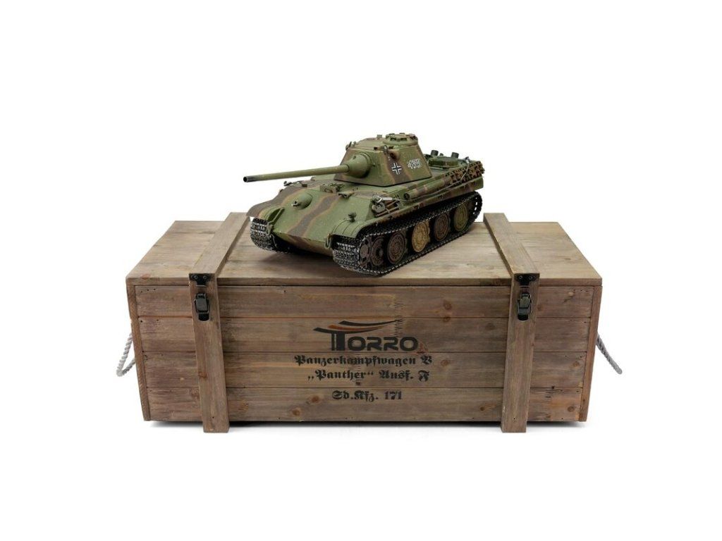 S hmotností kolem šesti kilogramů je Panther F ideální pro náročného zákazníka. V profesionální edici se vyznačuje vynikající kvalitou barvy airbrush, technologií desek plošných spojů 2,4 GHz a novým reproduktorem. Tento model má vynikající jízdní vlastnosti, širokou škálu funkcí a realistický zvuk. Vysoce kvalitní pásy, hnací a vodicí kola s válečky, stejně jako spodní část trupu a bojová věž jsou vyrobeny z kovu. Mnoho malých dílů a různých samolepek dokonale završuje repliku věrného měřítka.