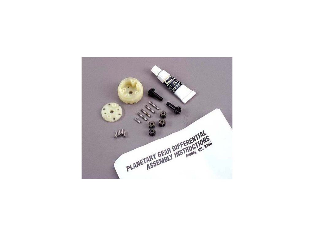 Kompletní planetový diferenciál s čelními ozubenými koly pro 2WD RC auta Traxxas Bandit, Stampede a Rustler. Diferenciál má platové oběžné ozubené kolo.