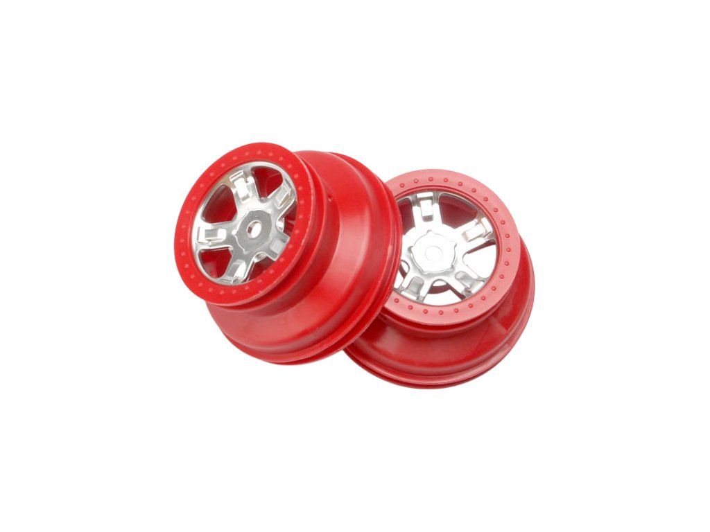 Disky kol univerzální SCT chromově matné s červeným ráfkem. Průměr disku 36/46mm (1.4/1.8"), šířka 25mm. Pro auta Traxxas Slash 1:16 nebo Teton 1:18. Šestihran 12mm.