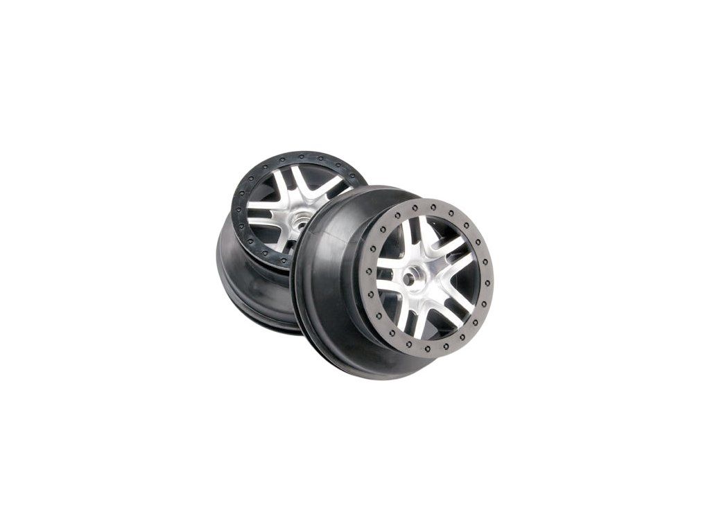 Disky kol 2WD přední SCT Split Spoke chromově matné s černým ráfkem. Duální průměr disku 2.2/3.0", šířka 41mm. Pro auta Traxxas Slash 2WD. Šestihran 12mm.