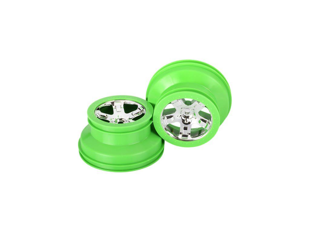 Disky kol 2WD zadní, 4WD přední/zadní SCT chromově lesklé se zeleným ráfkem. Průměr disku 56/76mm (2.2/3.0"), šířka 41mm. Pro auta Traxxas Slayer 3.3. Šestihran 12mm.