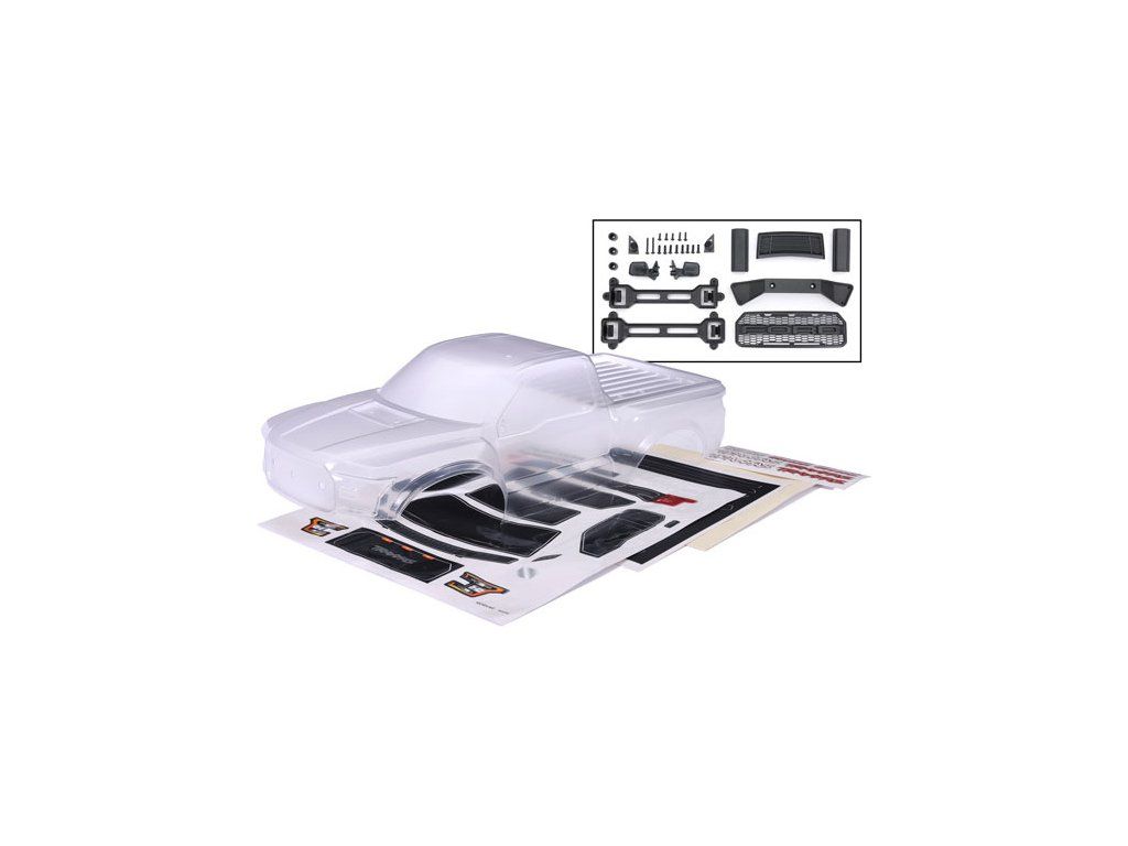 Karosérie Traxxas pro model 2017 Ford Raptor, čirá - vyžaduje barvení. Včetně masky oken a archu samolepek. Ochranná přestřikovací fólie. Včetně maketového příslušenství a západkové systému uchycení (bezsponkový systém).