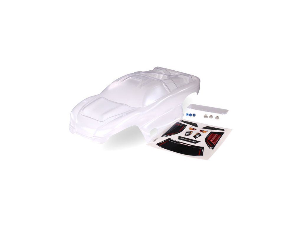 Nenabarvená lexanová karosérie Traxxas Nitro Rustler. Obsahem balení je dále arch samolepek.