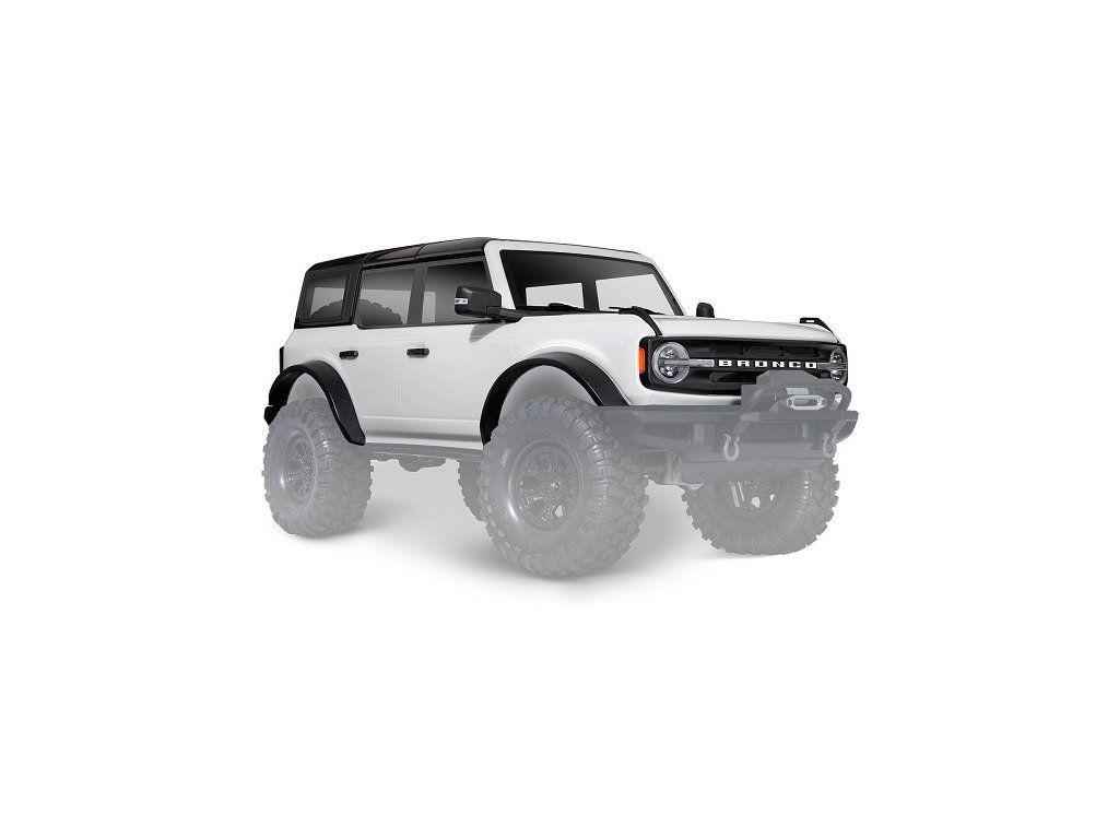 Traxxas karosérie Ford Bronco 2021 bílá - kompletní nabarvená. Určeno pro RC model Traxxas TRX-4 Ford Bronco 2021 nebo jiné modely TRX-4 s rozvorem 324 mm / konverzní sadou a s instalovanými blatníky pro bez-sponkové upínaní karoserie.