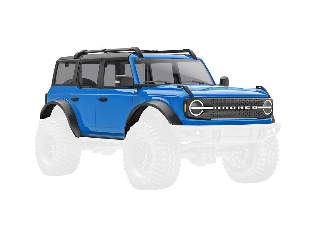 Traxxas karosérie Ford Bronco 2021 modrá, pro RC model auta TRX-4M. Bez-sponková karoserie v měřítku 1:18 z ABS, kompletní, včetně čirých oken, makety rezervního kola, lemů blatníků, bočních zrcátek a dalších detailů.