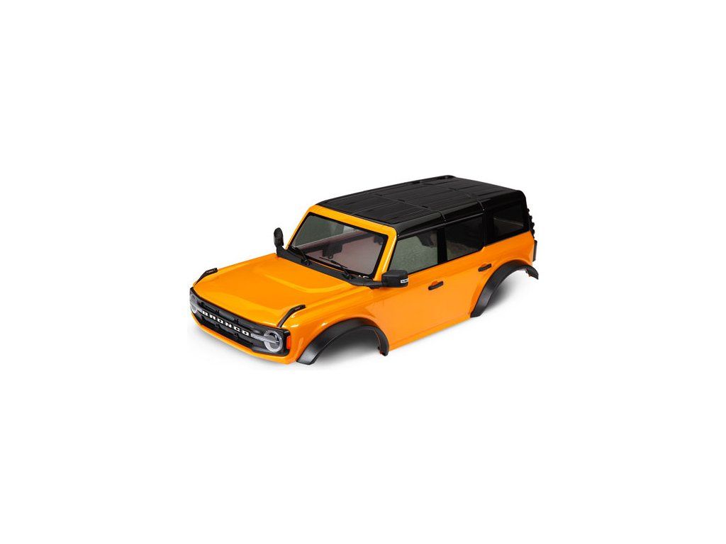 Traxxas karosérie Ford Bronco 2021 oranžová - kompletní nabarvená. Určeno pro RC model Traxxas TRX-4 Ford Bronco 2021 nebo jiné modely TRX-4 s rozvorem 324 mm / konverzní sadou a s instalovanými blatníky pro bez-sponkové upínaní karoserie.
