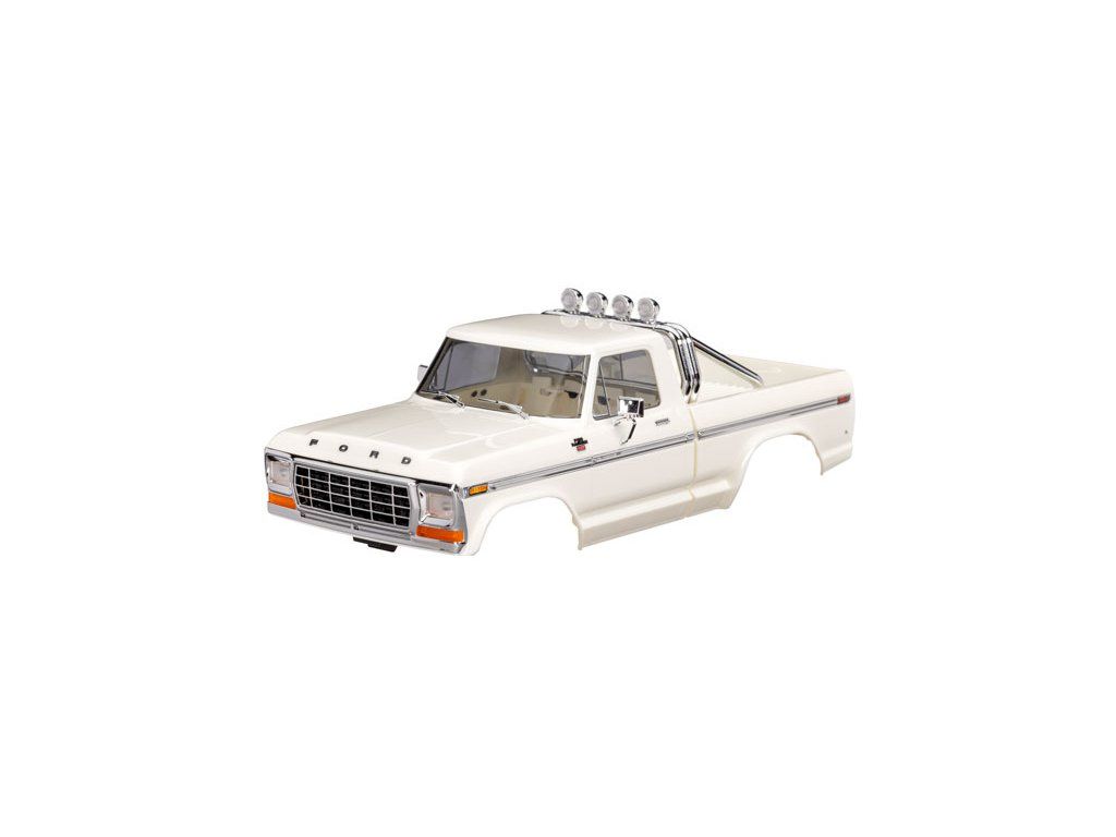 Traxxas karosérie Ford F-150 1979 bílá, pro RC model auta TRX-4M s delším rozvorem 162 mm (High Trail). Bez-sponková karoserie v měřítku 1:18 z ABS, kompletní, včetně mřížky chladiče, zrcátek, klik dveří, ochranného rámu, stěračů, bočních lišt a dalších detailů.