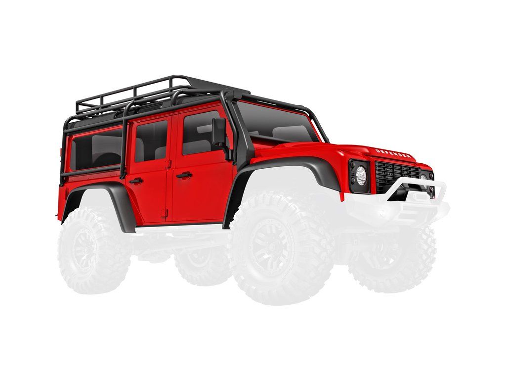 Traxxas karosérie Land Rover Defender červená, pro RC model auta TRX-4M. Bez-sponková karoserie v měřítku 1:18 z ABS, kompletní, včetně čirých oken, makety rezervního kola, kanystrů, heveru, lemů blatníků, bočních zrcátek a dalších detailů.
