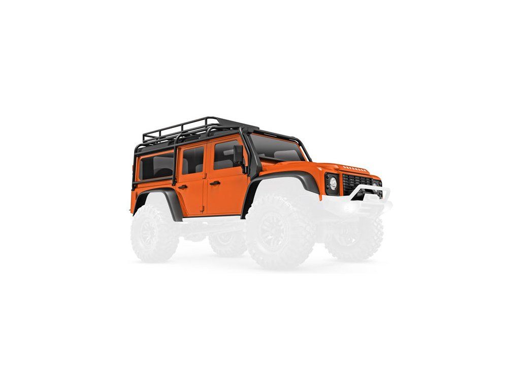 Traxxas karosérie Land Rover Defender oranžová, pro RC model auta TRX-4M. Bez-sponková karoserie v měřítku 1:18 z ABS, kompletní, včetně čirých oken, makety rezervního kola, kanystrů, heveru, lemů blatníků, bočních zrcátek a dalších detailů.