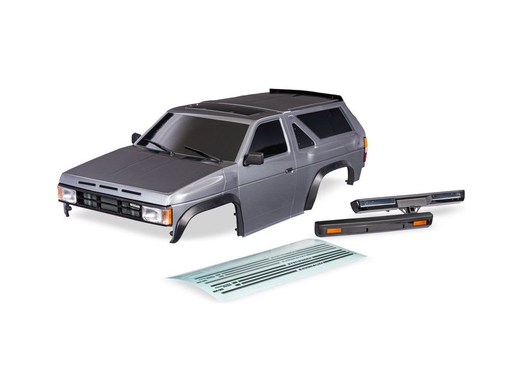 Traxxas karosérie TRX-4 Nissan Pathfinder 1988 stříbrná (bezsponková). Kompletní, nabarvená. Včetně masky chladiče, zrcátek, klik dveří, stěrčů a předního a zadního nárazníku. Rozvor 312 mm. Určeno pro montáž na blatníky TRA8080X.