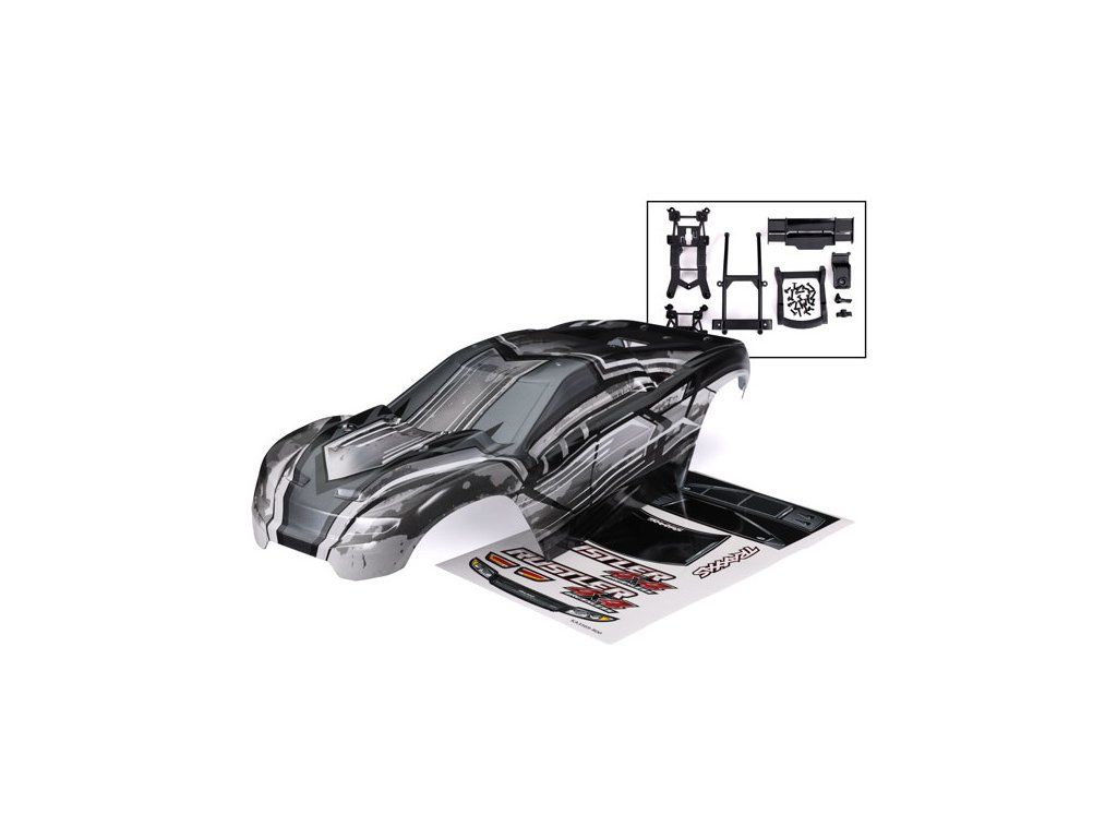 Traxxas karosérie Rustler 4X4 ProGraphix - čirá karoserie s nanesenou grafikou, vyžaduje barvení. Včetně bezsponkového držáku pro upevnění.