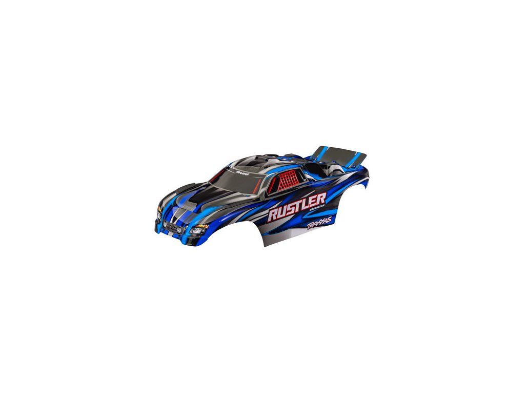 Traxxas karosérie Rustler modrá (bezsponková), hotová nabarvená, aplikované obtisky. Vhoná i pro Rustler VXL. Včetně předního a zadního bezsponkového držáku karoserie.