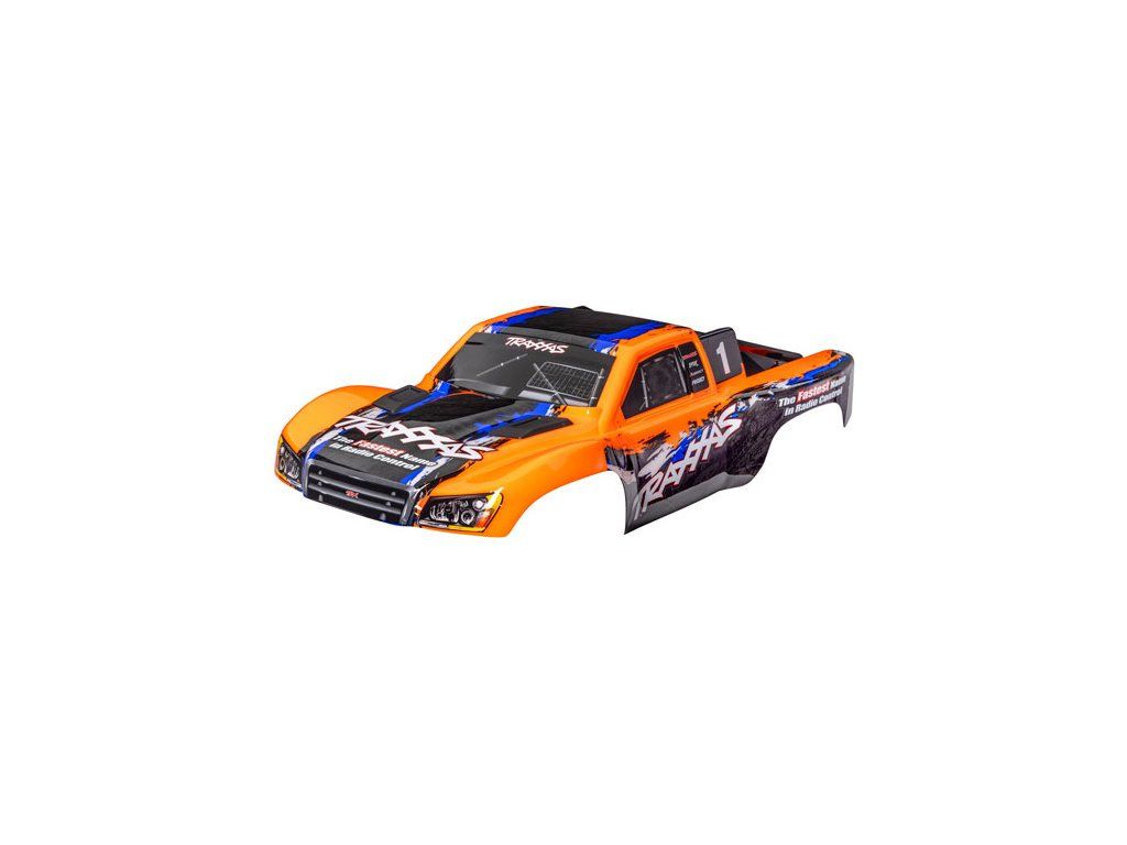 Traxxas karosérie Slash 4X4 oranžová (bezsponková). Nabarvená, sestavená karoserie, včetně bezsponkového držáku pro upevnění. Pro starší šasi Slash se sponkovým systémem upínaní karoserie je vyžadován díl #6940 (Slash 2WD), nebo díly #6976 a #10125 (Slash 4x4).