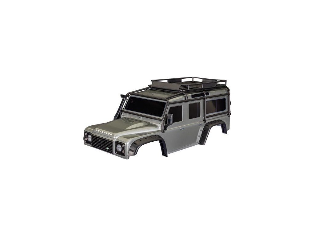 Traxxas karosérie TRX-4 Land Rover Defender stříbrná (bezsponková). Kompletní, nabarvená. Včetně střešního nosiče, maket kanystrů, heveru a rezervního kola. Rozvor 324 mm. Určeno pro montáž na blatníky TRA8080R.