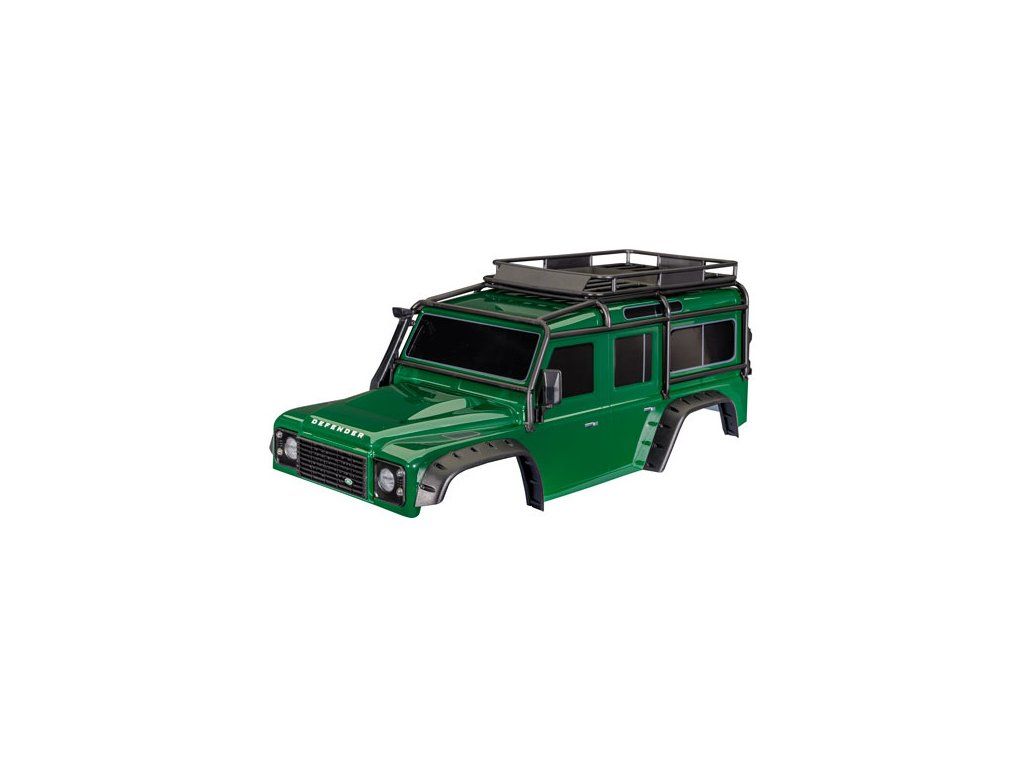 Traxxas karosérie TRX-4 Land Rover Defender zelená (bezsponková). Kompletní, nabarvená. Včetně střešního nosiče, maket kanystrů, heveru a rezervního kola. Rozvor 324 mm. Určeno pro montáž na blatníky TRA8080R.
