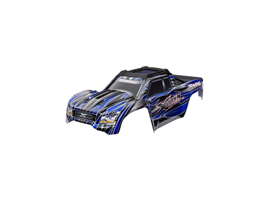 Traxxas karosérie X-Maxx Ultimate modrá, nalakovaná, aplikované obtisky, sestavená s předními a zadními držáky karoserie, zadní rámem a zadním ochranným plátem.