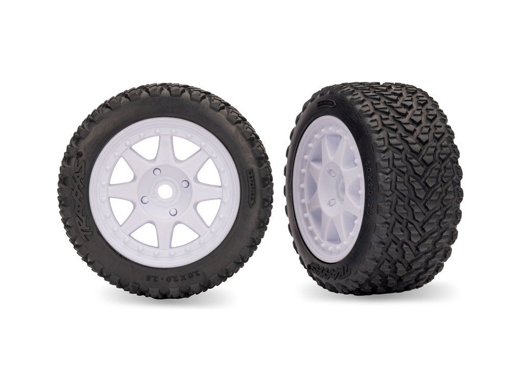 Kompletní přední kola pro RC model auta Traxxas Mini Rally. Disk 8-spoke 2.5" bílý, pneu Rally, přední (2 ks). Rozměry ø76x51mm. Unašeč - šestihran 12 mm.