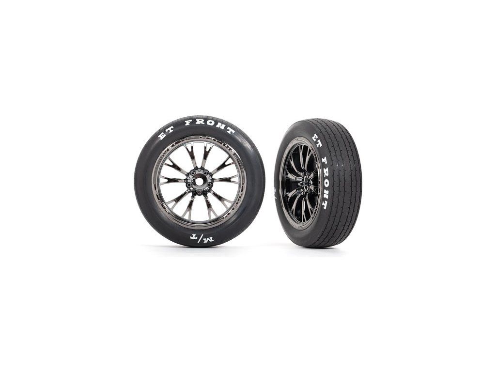 Traxxas kolo, disk Weld chromovaný černý (přední) (2 ks) s pěnovou vložkou a nalepenými pneumatikami. Přední dragsterová kola Mickey Thompson jsou replikou skutečných pneumatik. Speciálně vyvinutá směs pneumatik pro dlouhou životnost a maximální přilnavost.
